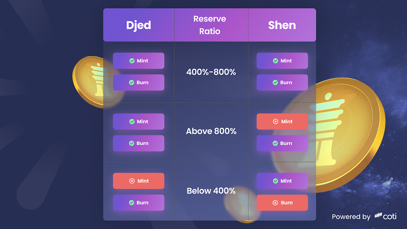 To protect $DJED holders, $SHEN holders are not allowed to burn $SHEN when the reserve ratio is below the minimum threshold of 400%.